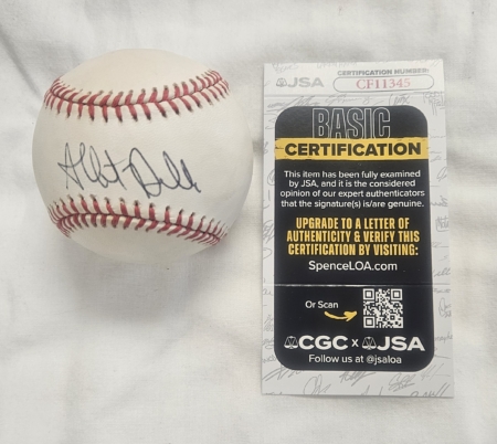 Albert signed this American League ball on the sweet spot. This ball will come with a JSA certificate.