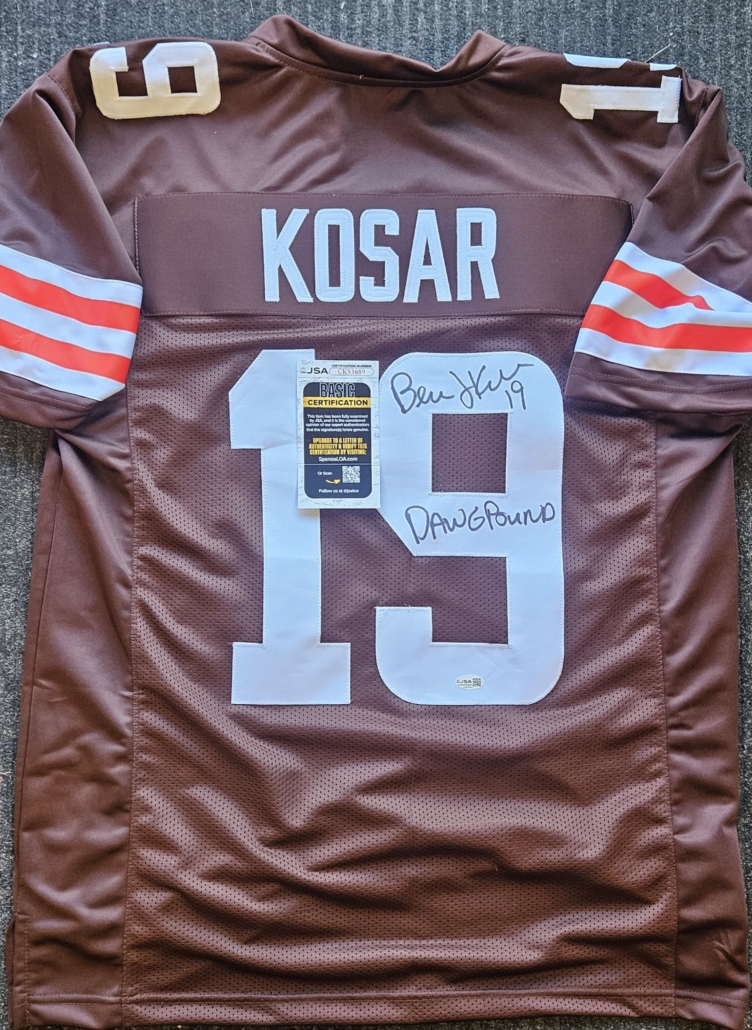 This SIGNED jersey of Bernie would make that die hard Browns fan very happy! Bernie has added the Dawg Pound inscription. Signed in black sharpie on this embroidered jersey. This jersey will come with a JSA certificate.
