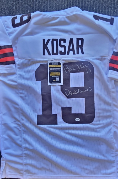 This SIGNED jersey of Bernie would make that die hard Browns fan very happy! Bernie has added the Dawg Pound inscription. Signed in black sharpie on this embroidered jersey. This jersey will come with a JSA certificate.