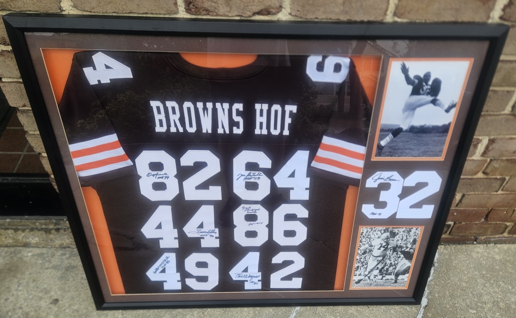 This 42×24 framed jersey includes multiple Hall of Famers. Brown, Newsome, Kelly, Warfield and Lavelli just to name a few.