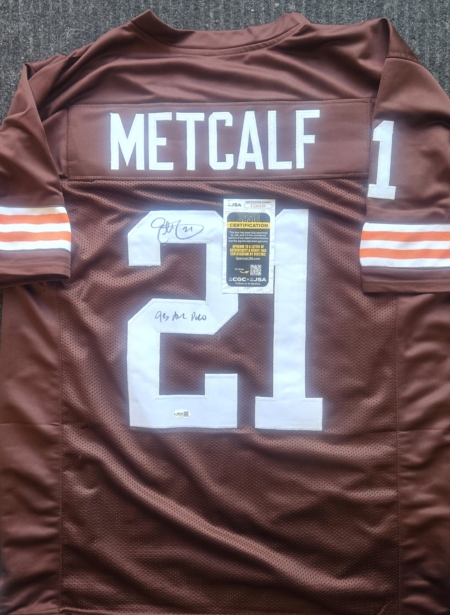 Eric signed this custom style jersey on the number and has added his inscription. This XL size custom jersey will come with a JSA certificate.